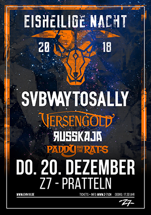Wenn Subway To Sally in der Vorweihnachtszeit ihre „Eisheilige Nacht“-Tour in neun ausgesuchte Städte bringen, wird die besinnlich-bedächtige Adventslaune im Handumdrehen in eine ausgelassene Party-Stimmung verwandelt. Da bleibt kein Auge und schon gar keine Kehle trocken. Zum 10-Jahr-Jubiläum dieser kultträchtigen Veranstaltungen haben sich die Potsdamer Mittelalter-Metaller wieder ein feines Line-Up mit grossartigen befreundeten Bands zusammengestellt. Neben dem unangefochtenen Headliner stehen im Dezember 2018 die äusserst wandlungsfähigen Deutsch-Folkrocker Versengold, die Multikulti-Truppe Russkaja aus Wien mit ihren feurigen Turbopolka-Liedern und die Irish-Speed-Folker Paddy & The Rats aus Ungarn auf den Bühnen der neun erlesenen Tour-Stationen.