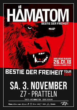 Mit ihrem neuen Werk „Bestie der Freiheit“ ist der oberfränkischen Band Hämatom der ganz grosse Wurf gelungen. Das Album landete auf Platz 2 der deutschen Hitparade. Das Szenemagazin Metal-Hammer lobt: „Mit dem Mix aus gewissem Onkelz-Pathos, Hosen-Süffigkeit und modernem NDH-Biss scheinen sie den Zeitgeist der deutschen Rock-Hörer zu treffen. ‚Bestie der Freiheit’ beisst sich direkt fest, überzeugt mit schmissigen Passagen, metallischen Momenten und textlicher Galligkeit.“