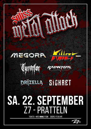 Am 22. September werden dies gleich sechs Bands mit viel Krach und Druck und Herzblut unter Beweis stellen. MEGORA, KILLER, TYRMFAR, RADWASTE, DRIZELLA und SICKRET können es kaum erwarten mit euch allen ein schwermetallisches Fest zu feiern, wenn es wiedermal heisst: Ab nach Pratteln zur SWISS METAL ATTACK !