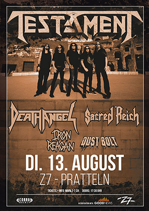 Seit über drei Jahrzehnten liefern Testament im Studio und auf der Bühne mit schöner Regelmässigkeit unverfälschten und ungezügelten Thrash-Metal in seiner reinsten Form ab.In diesem Jahr kommt das Bay-Area-Quintett mit einem neuen Studioalbum und vier fantastischen Support-Bands nach Pratteln. Als Special Guest sind nebst den legendären Death Angel die Thrash-Ikonen Sacred Reich am Start, die im Sommer ebenfalls neue Songs veröffentlichen. Davor sorgen Iron Reagan mit ihrem Mix aus Thrash- und Hardcore-Hymnen für Bewegung im Moshpit. Als Opener stehen die aufstrebenden deutschen Old-School-Thrasher Dust Bolt auf der Bühne.