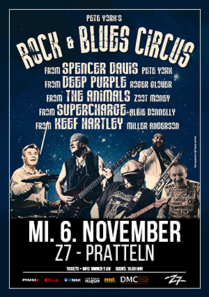 Der Ausnahmedrummer Pete York gastiert mit seinem fantastischen „Rock & Blues Circus“ in Pratteln. Das Line-Up verspricht einen wahren Leckerbissen für Musikfans, denn Pete York bringt ein paar hochkarätige Freunde mit. Gemeinsam mit Legenden wie Miller Anderson, Roger Glover, Zoot Money und Albie Donnelly zelebriert er diverse Highlights der Rockgeschichte und spielt Hits der Spencer Davies Group, von den Animals oder Deep Purple.
