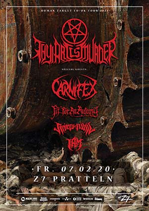 Auch wenn dieser Freitag nicht der 13. sondern der 7. Februar ist, werden düstere Wolken über Pratteln aufziehen. Thy Art Is Murder, bewaffnet mit ihrem neusten Schlachtwerk "Human Target", werden die neue Scheibe durch Europa prügeln und in der Konzertfabrik Z7 ihren einzigen Halt in der Schweiz machen. Die Heavy Growls kombiniert mit messerscharfen Riffs und knochenbrechenden Breakdowns sind ihre Spezialität und machen sie unverkennbar brutal. Nach ihrem gefeierten Auftritt als Festivalabschluss am Open Air Gränichen 2019 hinterliessen sie nur noch Staub und Asche.