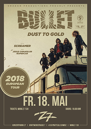 Vier Jahre nach ihrem letzten Output melden sich die Schweden Bullet mit ihrem neuen Album „Dust To Gold“ (Release: 20. April) lautstark zurück. Das Album handelt vom Leben on the road, von Freiheit, Abenteuer und dem unendlichen Spass einer leidenschaftlichen Metal-Band. Und diese Metal-Band, deren grosse Vorbilder legendäre Namen wie AC/DC, Judas Priest, Saxon, Accept, Rose Tattoo oder Motörhead tragen, ist wieder bereit, mit ihrem uralten Volvo-Tourbus die Strassen Europas unsicher zu machen.