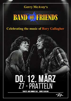 Anlässlich des 25. Todestages von Rory Gallagher macht auch die Besetzung der Band Of Friends einen Wandel durch. Gerry McAvoy am Bass und Brendan O´Neill an den Drums werden verstärkt durch zwei Gitarristen. Paul Rose und Stephan Graf werden mit den beiden Originalmitgliedern das Gesamtwerk in bekannter leidenschaftlicher Weise zelebrieren.