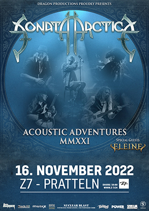 Wer die Melodic Metal Titanen Sonata Arctica bereits im Jahr 2019 auf ihrer Akustik Tour im Z7 erleben durfte, weiss, was uns im November 2021 erwartet, wenn die Finnen im Rahmen ihrer „Acoustic Adventures MMXXI"-Tour einen weiteren Konzert-Halt in Pratteln einlegen. Vorab erscheint im Oktober bei Nuclear Blast das Album „Acoustic Adventures – Volume One“, auf dem diverse Band-Hymnen aufs Wesentliche reduziert werden und in stimmigen Unplugged-Version ihre volle Pracht entfalten. Wir freuen uns auf eine weitere hochstehende Akustik-Session mit dem begnadeten Sänger/Songschreiber Tony Kakko und seiner Band. Das Vorprogramm bestreitet die schwedische Dark Symphonic Metal-Hoffnung Eleine, die rechtzeitig zur Tour ebenfalls ihr erstes Akustik-Werk präsentieren wird.