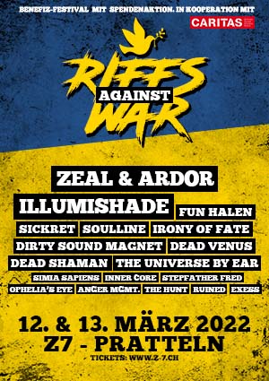 Auch wenn wir keine Vorstellung davon haben, wie schrecklich Krieg wirklich ist, so wissen wir doch, dass Krieg – ganz egal wo und wann auf dieser Welt – einfach nur Scheisse ist. Deshalb setzt die Schweizer Rock- und Metalszene unter dem Banner RIFFS AGAINST WAR nicht nur ein lautes Zeichen gegen den Krieg, sondern sammelt dabei auch Geldspenden!