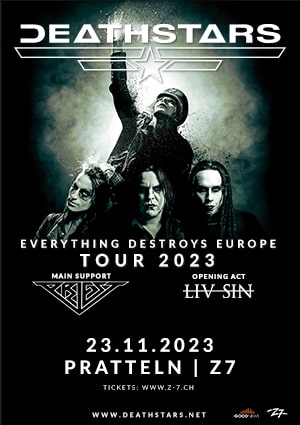 Das lange Warten hat sich gelohnt: Mit dem neuen Output „Everything Destroys You“ (Relase: 5.5.23) kehren die schwedischen Alternative-Metaller Deathstars mit voller Wucht zurück. Mit dem ersten Album seit neun Jahren setzt sich die Industrial-Kultband erneut die Krone auf. Das lang erwartete Comeback-Werk bietet denn auch alles, was ein gutes Deathstars-Album ausmacht: Adrenalin, Bombast, Sex & Glam. Im Vorprogramm stehen mit dem Synth-Wave-Trio Priest (mit zwei ehemaligen Ghost-Musikern) und der Metal Band Liv Sin zwei weitere heisse Schweden-Acts auf der Z7-Bühne.