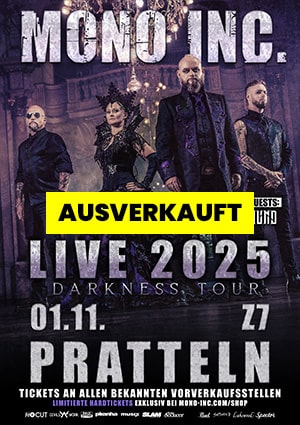 Die Hamburger Dark Rocker Mono Inc. surfen weiterhin auf der Erfolgswelle. Das letzte Studioalbum „Ravenblack“ schoss auf Platz 1 der deutschen Album-Charts. Die folgende Tournee entwickelte sich zum wahren Triumphzug. Und die Daten der „Symphonic Tour 2024“ waren allesamt schon lange im Vorfeld ausverkauft. Nun freuen wir uns auf den 1. November 2025, wenn die Band mit ihrem 13. Studioalbum „Darkness“ (Release: 15. August 25) wieder zu uns ins Z7 kommt, um mit den Schweizer Fans mit alten Hits und brandneuem Material 25 Jahre Mono Inc. zu feiern.