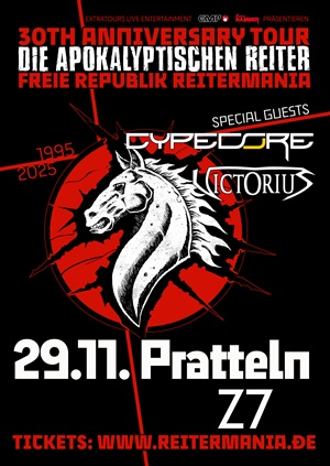 Die Apokalyptischen Reiter galoppieren auch nach drei Jahrzehnten im Musikbusiness unverdrossen weiter. Auf den Release des Jubiläumsalbums folgen diverse Sommerfestivals und zum Jahresende die „Freie Republik Reitermania - 30th Anniversary Tour“ mit Stop bei uns im Z7. Als Special Guest sind bei der grossen Geburtstagssause Robse mit dabei. Die Band um Ex-Equilibrium-Frontmann Robse Dahn präsentiert Songs aus dem gefeierten Debüt „Harlekin und Krieger“ und brandneue Kracher.