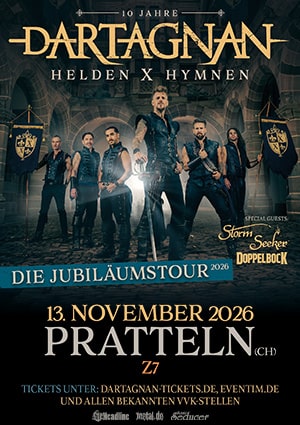 Am 13. November heisst es im Z7 wieder volle Pulle Folk-Rock-Power mit Mantel, Degen, Pulverdampf & Donnergroll’n. Die Muskettierrocker dArtagnan feiern mit der „Helden & Hymnen - Jubiläumstour 2026“ das erste Jahrzehnt ihrer fantastischen Karriere. Das Vorprogramm bestreiten die Folk-Metal-Piraten Storm Seeker und die Folk-Punk-Haudegen Doppelbock.