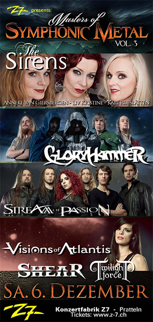 "Masters of Symphonic Metal" verspricht die volle Ladung bombastischer Klänge, bezaubernder Stimmen und packender Riffs! THE SIRENS (Anneke van Giersbergen, Liv Kristine und Kari Rueslåtten), GLORYHAMMER, STREAM OF PASSION, VISIONS OF ATLANTIS, SHEAR und TWILIGHT FORCE werden dafür sorgen, dass euch der Atem stockt und die Gänsehaut nicht nachlässt.